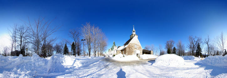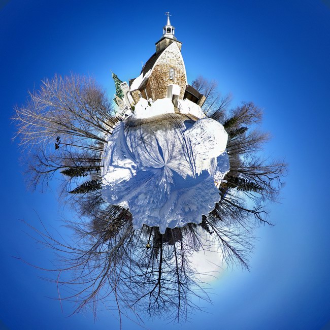 Panorama polaire produit grâce à une déformation en coordonnées polaires en ajoutant une bande blanche au panorama équirectangulaire.