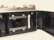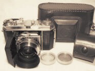 Cet appareil est la version sans télémètre de la IIa, son objectif est ouvert à f/2.8 au lieu de f/2.0. L'appareil est ici présenté avec le parasoleil et deux filtres. |