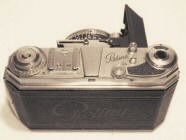 Sur le dessus on remarque l'aide mémoire, le sabot porte accessoire, le compteur, le déclancheur et le levier d'avance du film et d'armement de l'obturateur. |