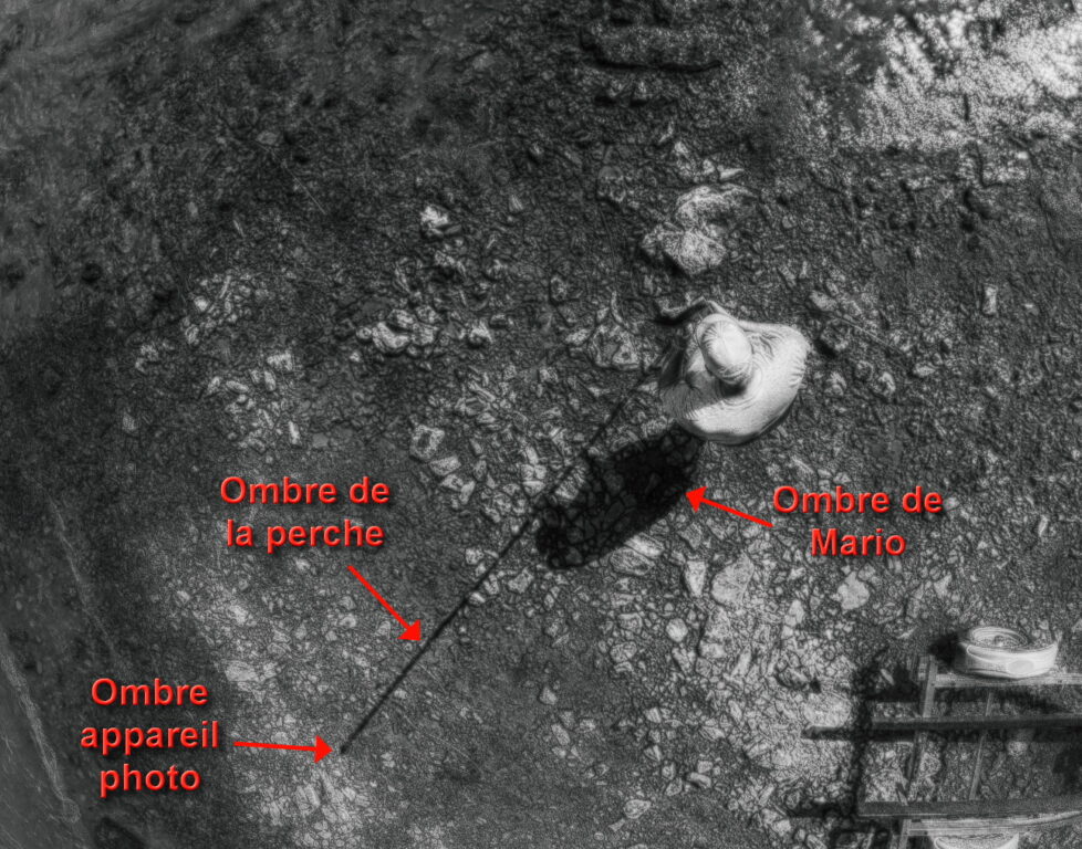Pour cette photo j’ai utilisé une perche de peintre (à trois sections) de 16 ½ pied muni d’un adaptateur permettant de passer du filet commun de ce gendre de pôle, vers une vis 1/4 pouce, 20 filets au pouce standard pour les appareils photo. J’ai aussi utilisé une «Attache Rapide» à très faible empreinte angulaire*.
