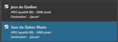 On crée d’abord les consignes d’exportation requises, une sans filigrane où les photos seront déposées dans un sous-dossier jeuxsf (sans filigrane) et une autre consigne où seront déposées les photos avec filigrane jeuxaf |
