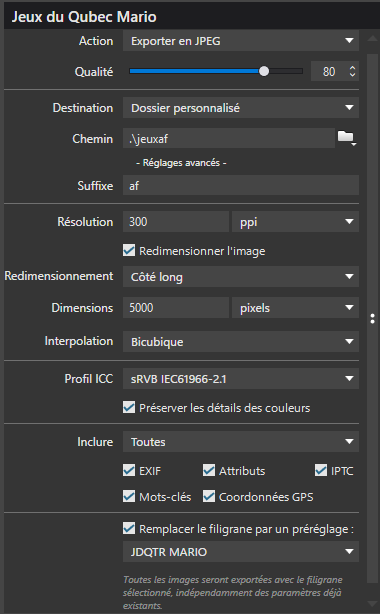 J’ai choisi de redimensionner les photos avec un grand côté de 5000 pixels, d’utiliser l’espace couleur sRVB et d’ajouter un filigrane fourni par les JDQ auquel j’ai ajouté mon nom. Pour l’endroit de l’exportation, afin d’enregistrer les photos dans un sous dossier j’ai utilisé cette notation : « .\jeuxaf » le point « . » indiquant l’endroit actuel de la photo, j’ai aussi ajouté un suffixe au nom du fichier exporté, indiquant que la photo possède un filigrane.