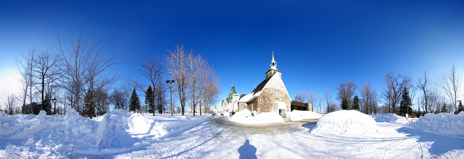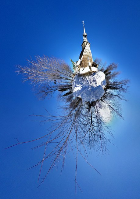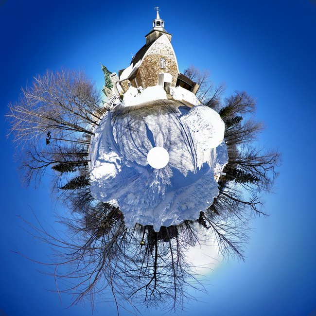 Panorama polaire produit grâce à une déformation en coordonnées polaires en ajoutant une bande blanche au panorama équirectangulaire.
